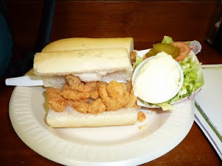 (1) The po'boy: not just a submarine or hero, but THE sandwich of Louisiana. You can get them from fine restaurants to corner stores to gas stations. Thought to originate in the 1920's when French bread was filled with potatoes and gravy to feed striking workers... I'd heard a lot about Johnny's Po-boy Restaurant in the French Quarter, so we got there for an early lunch.